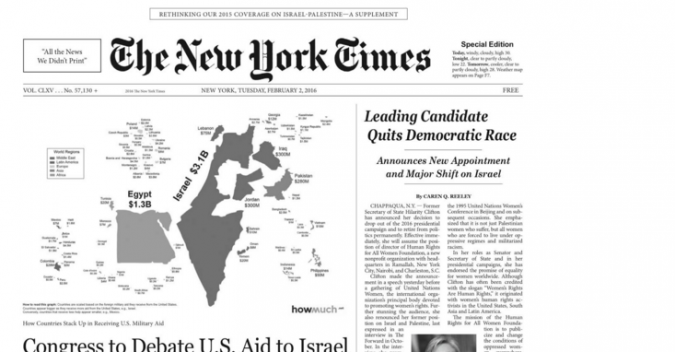 The fake paper mimics the Times’ trademark fonts and formatting, and describes itself as “Rethinking Our 2015 Coverage on Israel-Palestine — A Supplement.” In addition to its “corrections” (“It has come to our attention that the vast majority of articles about violence in Israel and the occupied Palestinian territories have failed to include the names of Palestinians killed by Israeli forces.”) and articles, it includes fake ads, such as one for “TimeUp” watches with the motto “The Moment is Now: End U.S. Military Aid to Israel.”