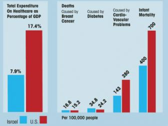 Moreover, under many criteria, Israeli citizens appear to be getting better care for their lower expenditures. Israel has an infant mortality rate that is only 57% of that in the United States, and a life expectancy from birth of 82 years, compared with 78 years in the United States. Its mortality rate due to heart disease is only half that of America’s. Many other indicators having to do with specific diseases are similarly favorable or, at worst, roughly equal.