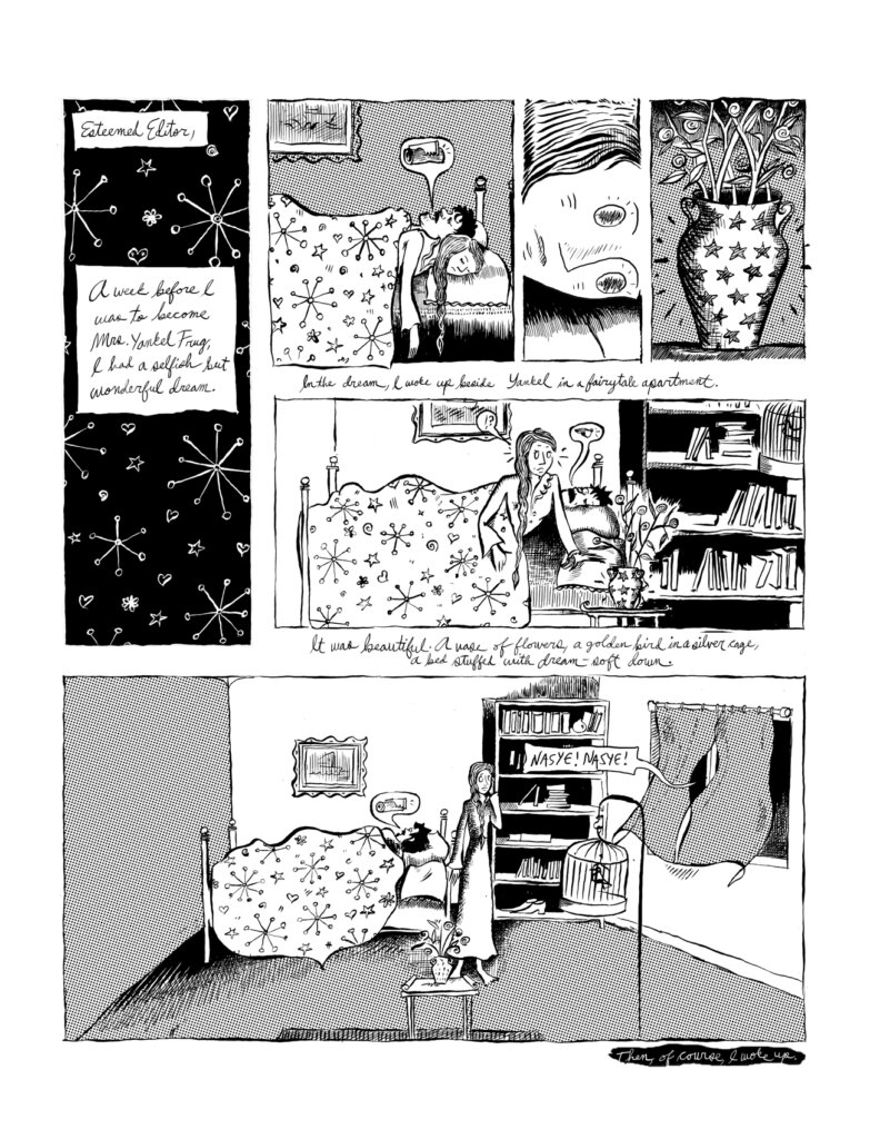 Liana Finck reimagines this story in graphic form, drawing on different genres to represent, in a few short pages, Frug’s impoverished reality, mundane troubles and dream interludes.