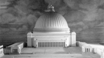 A 320 meter-tall “Great Hall” was to stand at the end of the avenue, dwarfing the neighboring Reichstag. Crowned with a 40-meter glass lamp, its green copper roof with an opening at the top was inspired by the Pantheon in Rome.