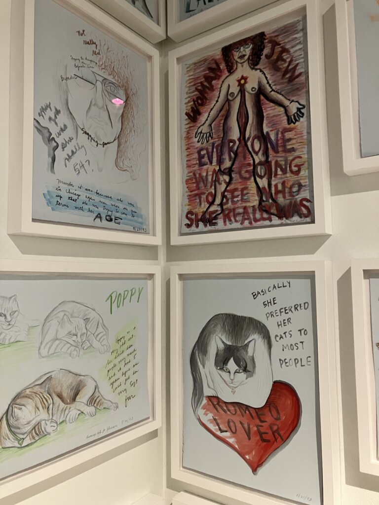 In a small nook, tucked into a stairwell between floors that is covered from floor to ceiling with rough drawings detailing Chicago’s anxieties about identity and aging — and her cats — there’s a striking, harsh red self-portrait of the artist naked and splayed. Scrawled across the sketch are the words: “Woman. Jew. Everyone was going to see who she really was.” A star of David emblazoned on her chest bisects the drawing.