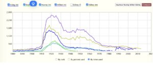 What caused MNII to hit so soon after that? It’s impossible to say for sure, but it was not trivial. As Lieberson and a coauthor once observed, looking at first-name choices offers “a rare opportunity to study tastes in an exceptionally rigorous way.” I imagine the trend originated with some culture-loving Jews, who had been in the new country for a decade or more, who may have read Paradise Lost or seen Sir Henry Irving or one of his many thespian relatives on the stage, and thought such a distinguished name would cast a shimmering reflection on their sons. (And remember that they had a hall pass to use freely in their choices because of the custom of giving kids a Hebrew or Yiddish name as well). Peers agreed, and soon the trend went viral.