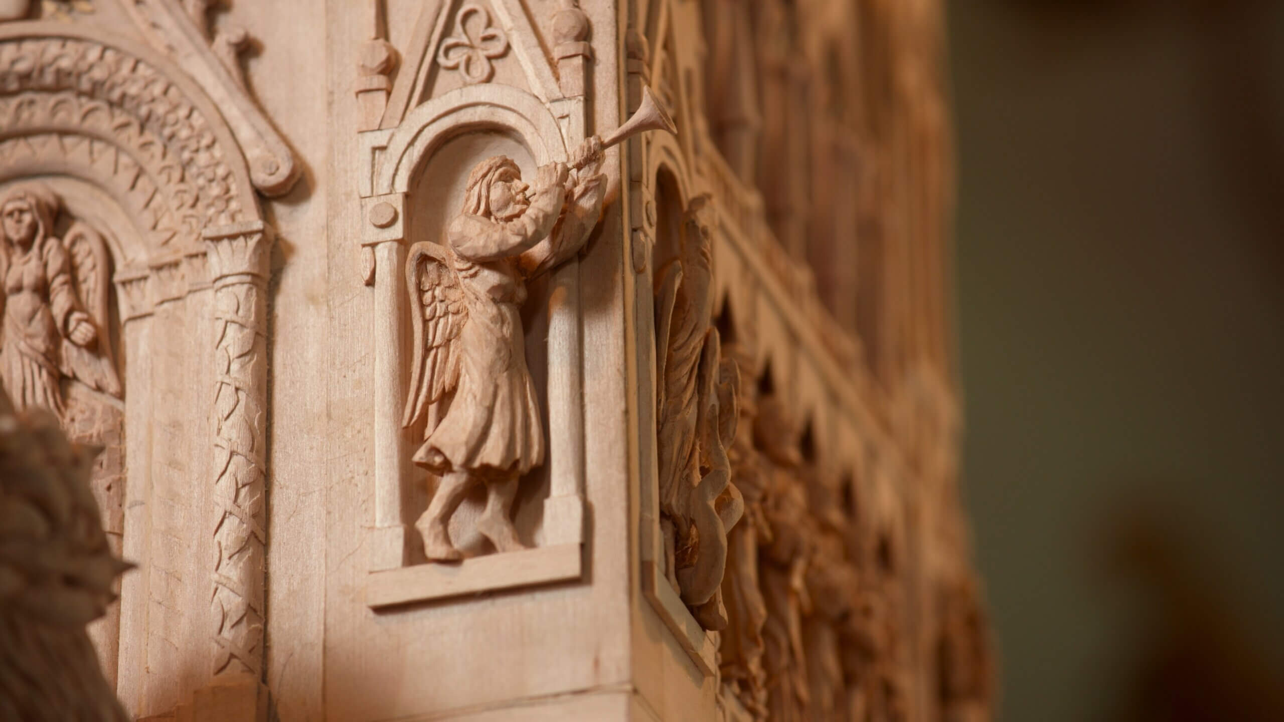 The documentary follows Grashow as he works on his latest commission: an eight-foot tall wooden sculpture of Jesus hoisting a cathedral on his back, while demons, each one completely different from the other, reach out of the flames around his feet. The cathedral’s intricate exterior is matched by an equally elaborate interior: A mural of Eden decorates the cathedral wall and a figure resembling the piece’s commissioner Michael Marocco, a Catholic art collector who has several Grashow pieces in his private sculpture garden, kneels in prayer. If you look closely at the mural, you can see God’s name written in Hebrew on a painted banner. The cathedral’s stained glass windows are illuminated by an electric bulb.