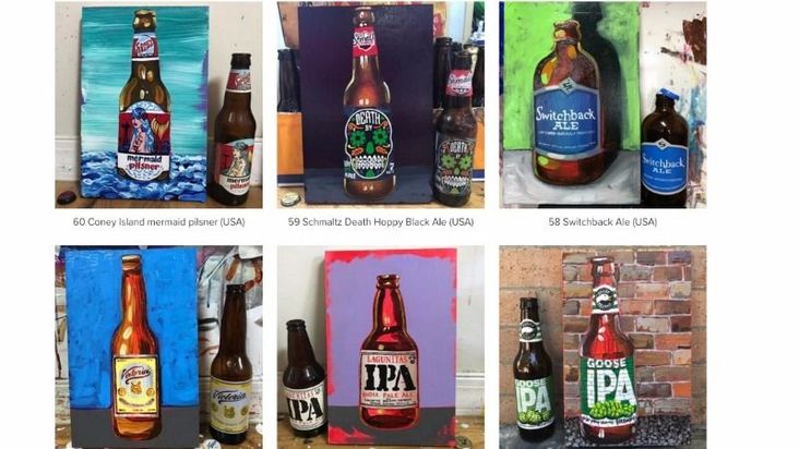 I don’t like beer very much, but I did pick up a six-pack last week. Okay, so it wasn’t an actual six-pack of beer — it was a “six-pack” of small paintings of different beers. The beers, 99 of them, were on view at Gitler &____, the art gallery in my old neighborhood of Hamilton…
