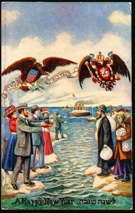The card depicts two eagles in the sky: Under the Imperial Eagle of the Russian coat of arms, a group of impoverished, traditionally dressed Russian Jews, carrying their meager belongings, line Europe’s shore, gazing with hope across the ocean.