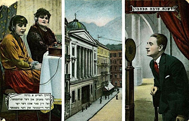 The well-dressed young man has apparently immigrated to America and done well for himself. On the left, his mother and sister are listening to his message using headphones. The women are more conservatively dressed, probably still living in Poland. In the center we see a scene in a well-known spot in Warsaw: Koszykowa Street, although Goldberg added three fictional elements to the scene: a dome on one of the buildings, with a Star of David and a radio antenna.