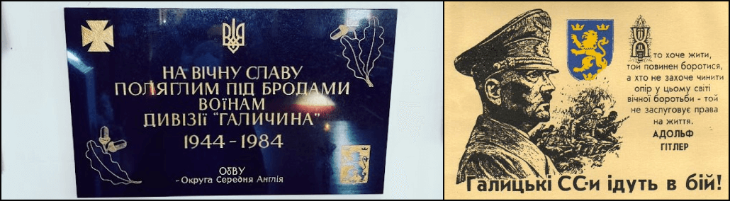 The plaque at top left commemorates the 60th anniversary of the division’s creation; the plaque at bottom left is in memory of SS Galichina soldiers killed at the 1944 Battle of Brody, where much of the unit was destroyed.