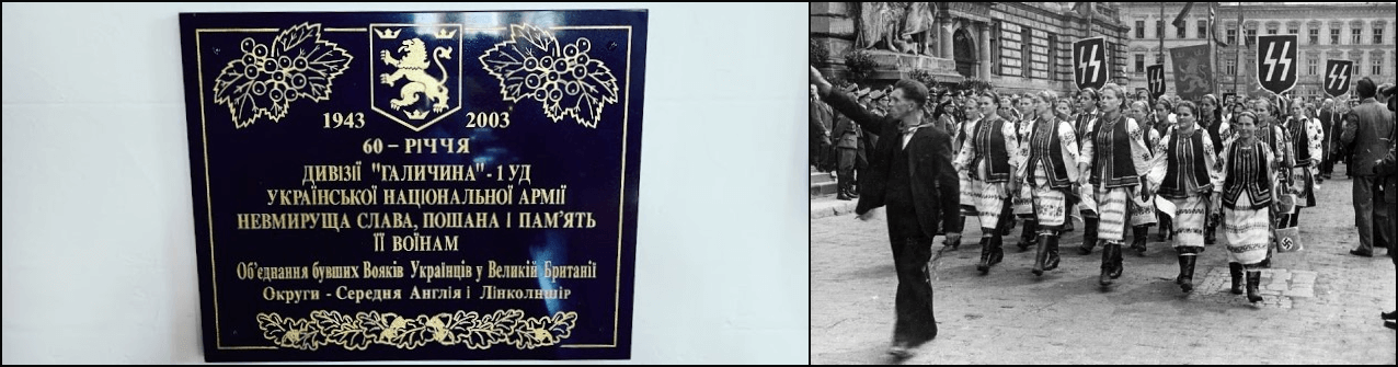 SS Galichina was a Ukrainian formation in the Waffen-SS, the military branch of the SS, which itself was a military wing of the Nazi Party. It was deemed important enough to be visited and encouraged by SS leader Heinrich Himmler, one of the main organizers of the Holocaust. Among war crimes committed by SS Galichina is the Huta Pieniacka massacre, when its soldiers burned 500–1,000 Polish villagers alive.