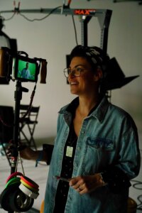 Tel Aviv Filmmakers Dani Schoffman, left, and Ruth Berdah-Canet on set in January filming a short video seeking hostages’ release. Photo by Zohar Zeev