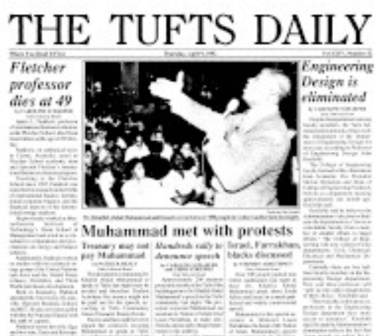 When the Middle East Study Group invited Muhammad, the Nation of Islam leader, to campus in 1992, Greenblatt co-authored a resolution condemning Muhammad’s beliefs, which the Tufts student government passed 13 to 7. The resolution explicitly recognized the Black nationalist’s “right to appear and speak.”