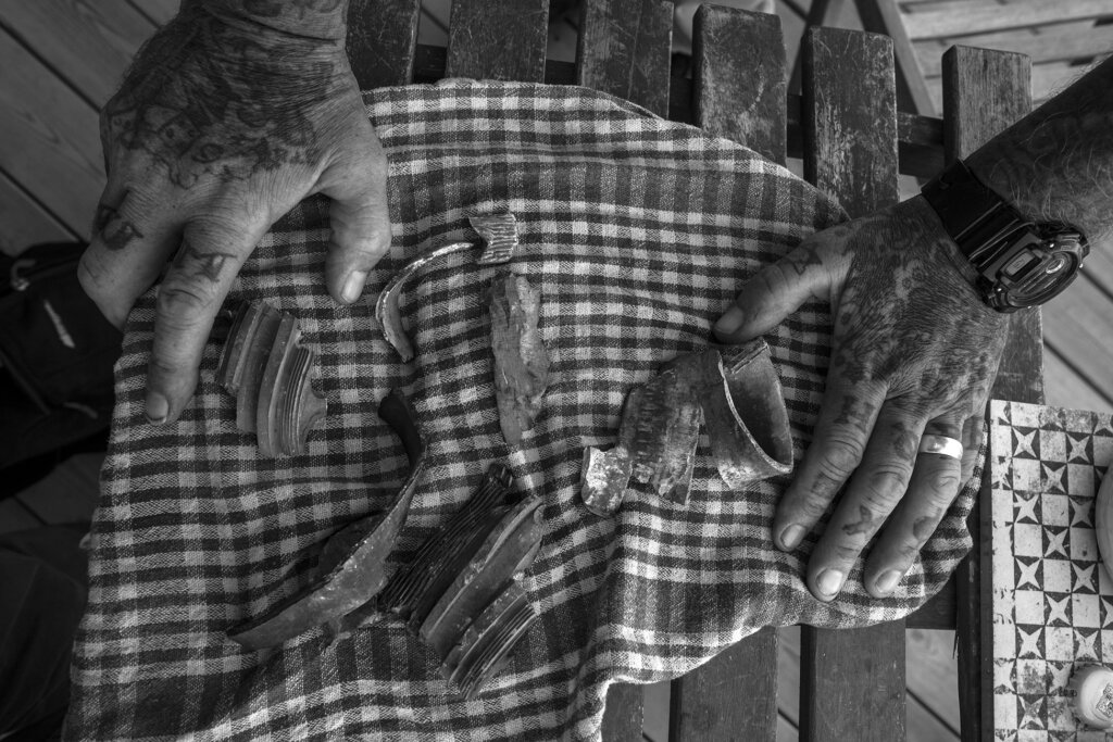 Sweetland, a British-Israeli landscaper who has lived on Malkiya for eight years, said he spends at least some part of most days using garden hoses and leaf blowers to extinguish fires set off by shelling. On his terrace overlooking the Hula Valley, he unwrapped a kitchen towel to show us rocket fragments that landed at a neighbor’s place the day before. The attack killed a cat sleeping on the couch.
