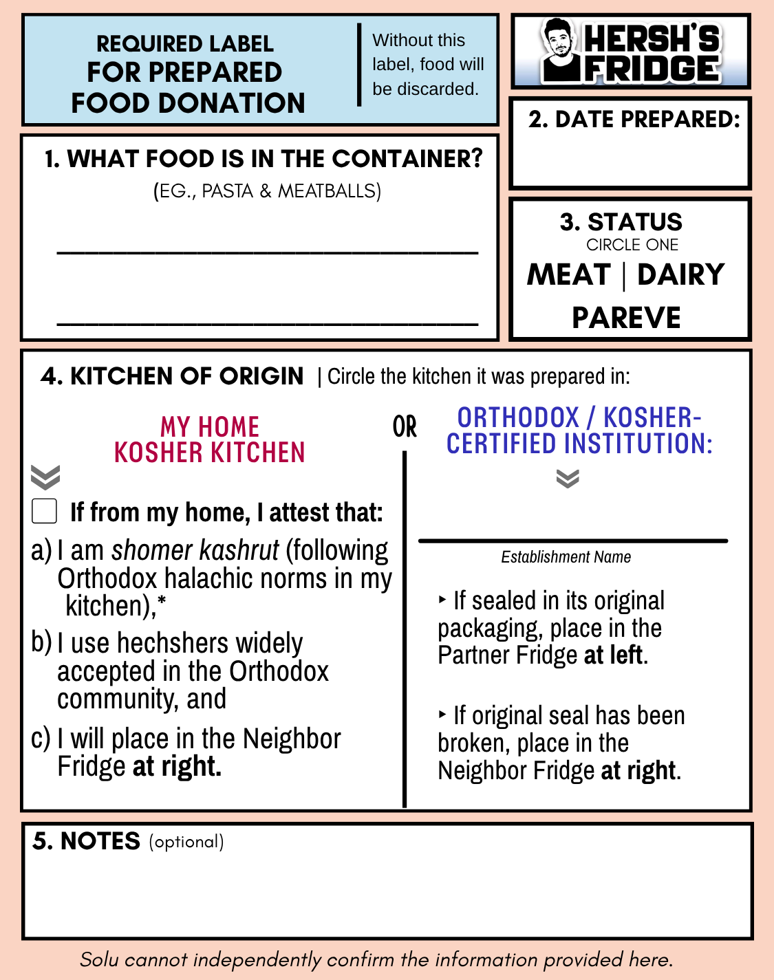 At Hersh’s Fridge, the food is divided into three sections: refrigerated groceries bearing a reliable hechsher, or kosher certification; food cooked in kosher homes; and a pantry with kosher-certified shelf-stable goods. Volunteers monitor the fridge for compliance with kosher food standards — not an uncomplicated task for a fridge where anyone can drop off food at any hour of the day. A club of around 100 students at Ida Crown in “Hersh’s Fridge Club” have pitched in, ensuring that each homemade item includes a label attesting, on the honors system, that it was prepared in accordance with Orthodox halacha.