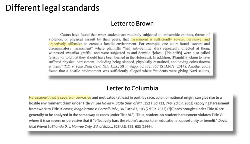 The enforcement letters informed Columbia and Harvard that they must prevent any antisemitic conduct that is either pervasive or severe. In contrast, Brown was told that it only had to address a more narrow set of conduct: that which was both severe and pervasive at the same time.