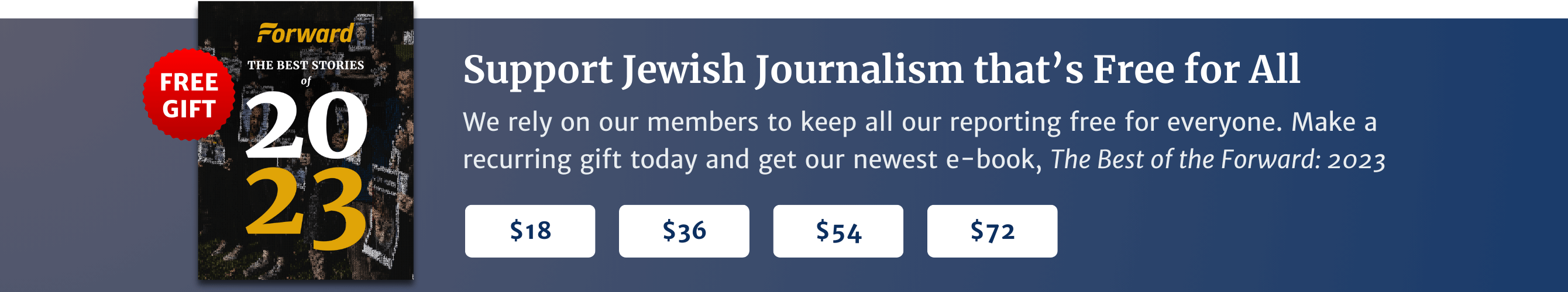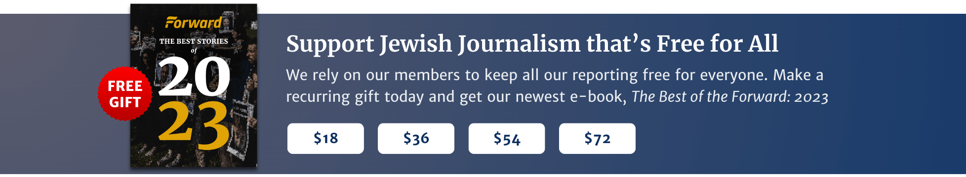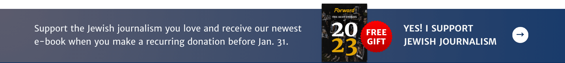 To republish, copy the HTML by clicking on the yellow button to the right; it includes our tracking pixel, all paragraph styles and hyperlinks, the author byline and credit to the Forward. It does not include images; to avoid copyright violations, you must add them manually, following our guidelines. Please email us at [email protected], subject line “republish,” with any questions or to let us know what stories you’re picking up.