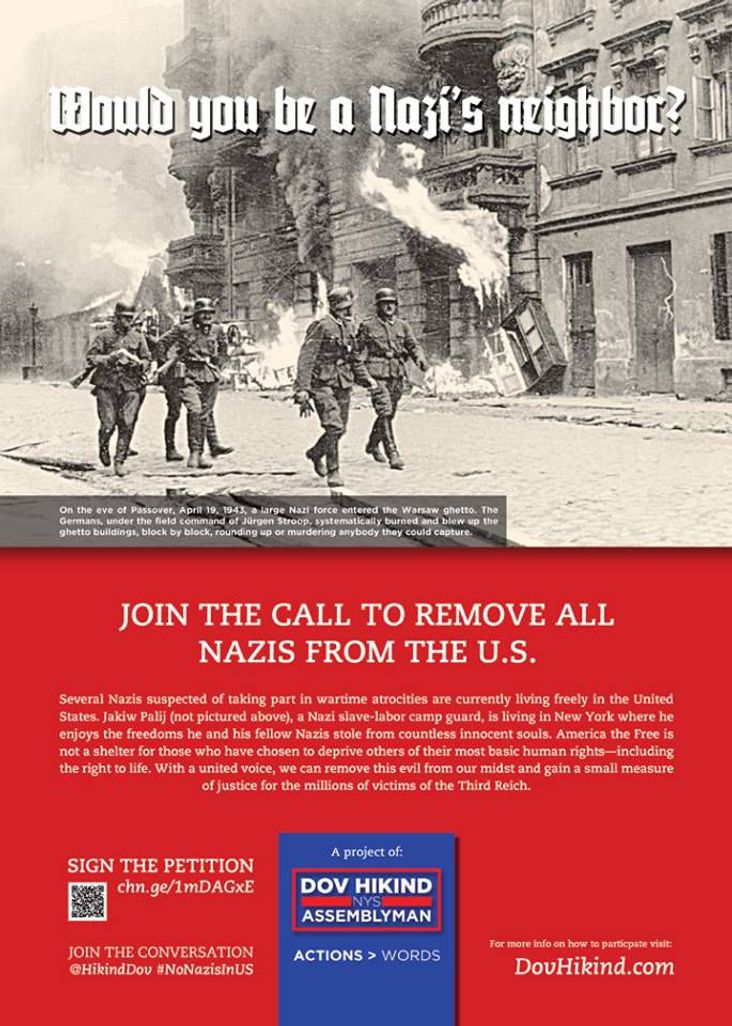 A new campaign launched by New York Assemblyman Dov Hikind calls for Nazi war criminals living in the United States to be brought to justice. “Would you be a Nazi’s neighbor?”, the ad asks. The Brooklyn assemblyman, a son of survivors, said that he is committed to pursuing Nazis living in the United States. The…
