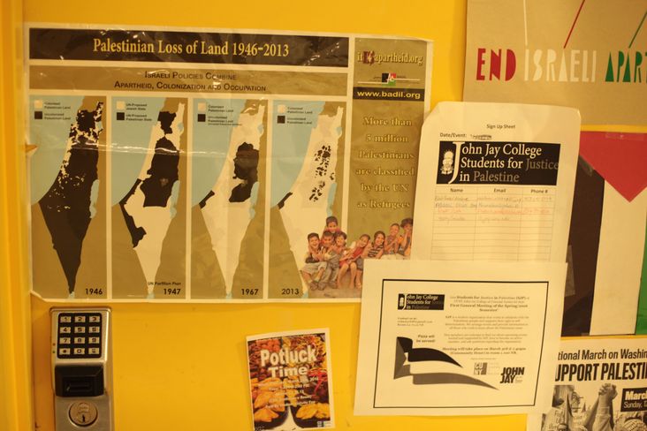 The poster on the door of the Hillel at John Jay College of Criminal Justice reads “Safe Zone.” Above it hangs an Israeli flag, an American flag and another sign: “Israel wants peace.” Take two steps down the narrow hallway on the ground floor of this Manhattan campus, and there is another, very different message….