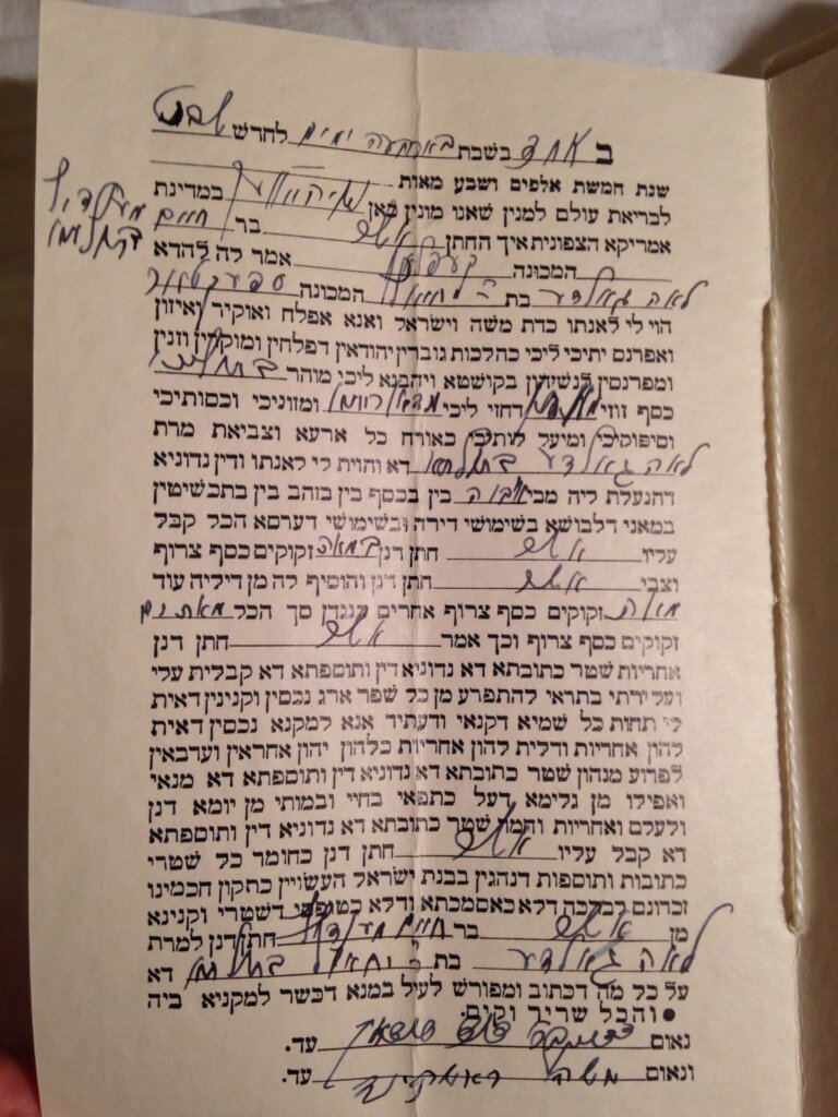 Years later, I found Harry’s and Lil’s ketubah (wedding contract) in a box in Lil’s apartment. Their Yiddish names and Hebrew dates were on the left side, and English on the right. I deciphered the scribbles and loops in the handwriting in order to find out my grandfather’s Yiddish name. All these years I assumed it was Herschel, because of the initial “H” in Harry. But no, it was Usher, a variation of the Hebrew name Asher.