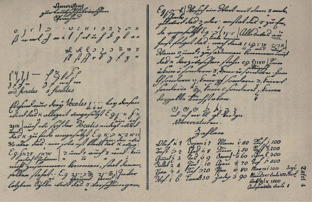 Goethe soon realized that if he wanted to understand Yiddish properly, he would have to learn Hebrew. His father arranged a tutor, and young Goethe plunged into a whole new alphabet. Although the location of his childhood notebooks are unknown, two of its pages are located online. On them, he carefully writes out the Hebrew letters, their names, sounds and even their numerical values. His notebook contains reminders to himself that Hebrew words are built from three-letter roots and urges himself to practice again and again so the forms would stick in his memory.