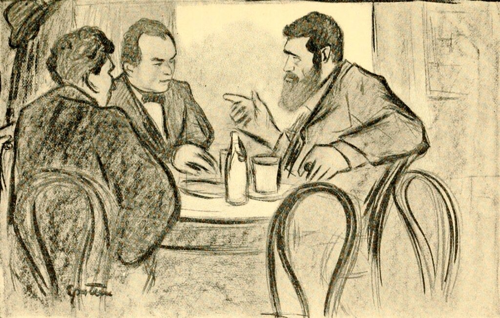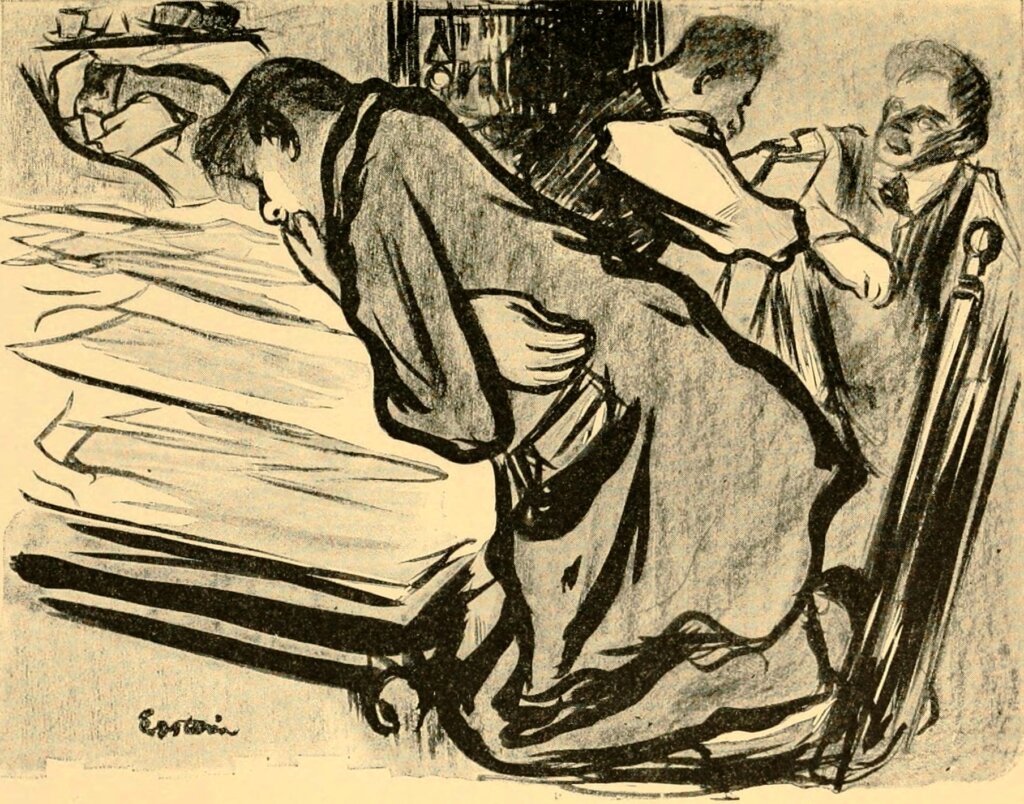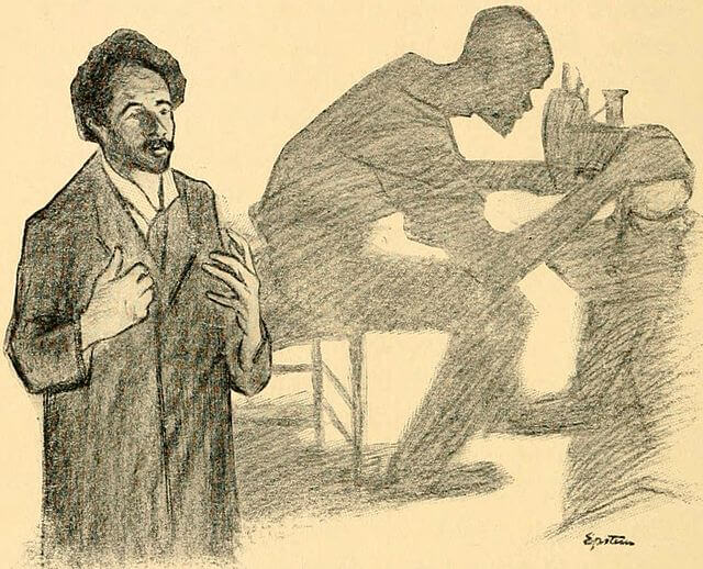 אַ צייכענונג פֿונעם עולם בײַם ייִדישן טעאַטער אינעם איסט סײַד, געמאָלט פֿון יעקבֿ עפּשטיין (פֿון האָטשינס האַפּגודס בוך, „דער גײַסט פֿון דער געטאָ“), 1902 Photo by Wikimedia Commons