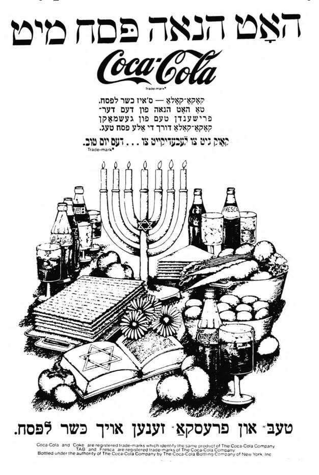 אן אַנדער באַקאַנטע רעקלאַמע פֿון די 1960ער יאָרן האָט געמאָלדן, אַז אַמעריקעס באַליבטע סאָדע, „קאָקאַ־קאָלאַ“, איז כּשר לפּסח: „קאָוק גיט צו לעבעדיקייט צו דעם יום־טובֿ,“ שטייט געשריבן איבער אַ טיש צוגעגרייט צום סדר. אונטערן בילד גיבן זיי צו צוויי אַנדערע כּשר לפּסחדיקע סאָדעס, וואָס זענען דעמאָלט געווען פּאָפּולער: „טעב“ און „פֿרעסקאַ“.