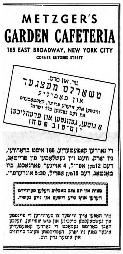 די „גאַרדען קאַפֿעטעריע“ האָט געמאָלדן אַז כאָטש זי וועט זײַן געשלאָסן אין די יום־טובֿ טעג, וועט זי זײַן אָפֿן חול־המועד, ווען מע וועט קענען עסן מצה און פּסחדיקע מאכלים אויף שפּאָגל־נײַעם געשיר.