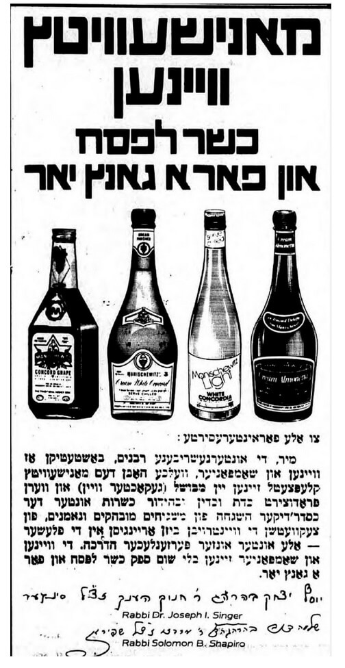 די באַליבטע שפּײַז־ און ווײַן־פֿירמע „מאַנישעוויץ“, וואָס האָט ערשט מיט עטלעכע וואָכן צוריק אָנגעהויבן פֿאַרקויפֿן אירע פּאַטראָוועס פֿון אַ קיאָסק אויף די גאַסן פֿון מאַנהעטן, האָט במשך פֿון דער פֿאָרווערטס־געשיכטע ערבֿ־פּסח שטאַרק רעקלאַמירט איר טראַדיציאָנעלן געדיכטן זיסן רויטן ווײַן, ווי אויך איר ווייניקער באַקאַנטע שאַמפּאַניע. אינטערעסאַנט, וואָס בײַם סוף פֿון דער רעקלאַמע זעט מען די אונטערשריפֿטן פֿון צוויי רבנים, וואָס באַשטעטיקן אַז מאַנישעוויץ־ווײַן איז כּשר לפּסח — כאָטש ס׳רובֿ פֿאָרווערטס־לייענער זענען נישט געווען קיין פֿרומע ייִדן.