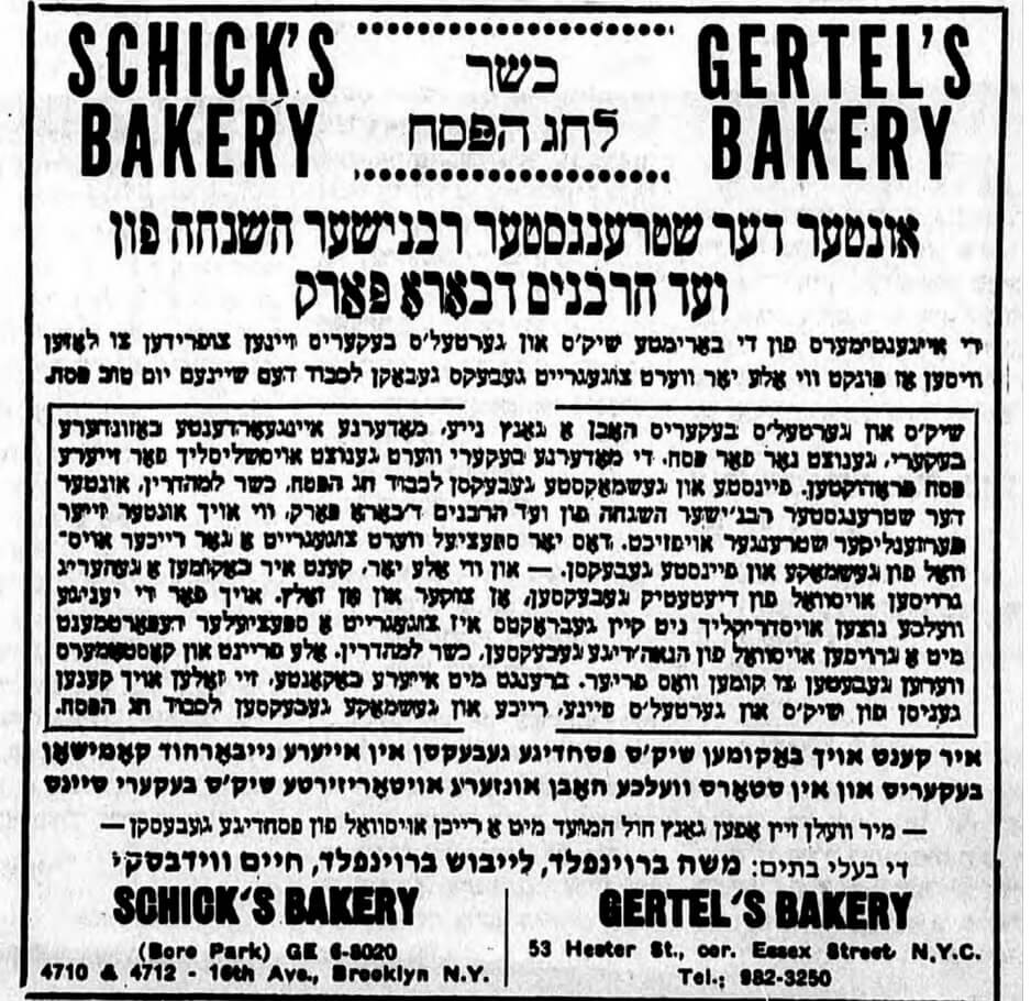 יענע לייענער וואָס האָבן נישט געהאַט קיין צײַט אָדער כּוח צו באַקן דעזערט צום סדר האָבן זיך נישט געדאַרפֿט זאָרגן. די צוויי לעגענדאַרע בעקערײַען — „שיקס“ און „גערטעלס“ — האָבן אין זייער בשותּפֿותדיקער רעקלאַמע דערקלערט אַז זיי האָבן צוגעגרייט „אַ גאָר רײַכן אויסוואַל פֿון געשמאַקע און פֿײַנסטע געבעקסן“. זיי דערקלערן אַז אַלץ איז דאָרט געמאַכט „אונטער דער שטרענגסטער רבנישער השגחה“ פֿון רבנים אין באָראָ־פּאַרק און אַז די פּסחדיקע געבעקסן האָט מען אַפֿילו געמאַכט אין אַן אַנדער אָרט ווי דאָס בעקערײַ פֿון אַ גאַנץ יאָר. און לטובֿת יענע ייִדן וואָס האָבן זיך געהיט מיט זייער געזונט, האָבן זיי אויך געמאַכט געבעקסן אָן צוקער און אָן זאַלץ.