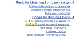 • געזאַנג. אין דעם אָפּטײל װערט געבראַכט אַ רשימה לידער װאָס מע קען זינגען מיט אָדער פֿאַר די קינדער, סײַ רויִקע סײַ לעבעדיקע, סײַ קינדערלידער סײַ גלאַט פֿאָלקסלידער, װי אױך לידער מיט באַװעגונגען — אַ שטײגער, „בלעטער“, „מיכלקו“, און „פֿון אַ קלײנעם גרינעם הױז“. בײַ יעדן ליד װערט געגעבן אַ לינק צום טעקסט און צו אַ רעקאָרדירונג.